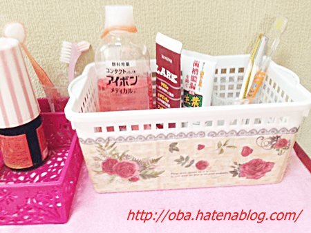 ふと思い立って、洗面台横の断捨離をしたついでに、薔薇の花模様にジュタった(ジュタドールで飾ることを言います)バスケットに歯ブラシや歯磨き粉を入れてみたら、結構華やかになりました。